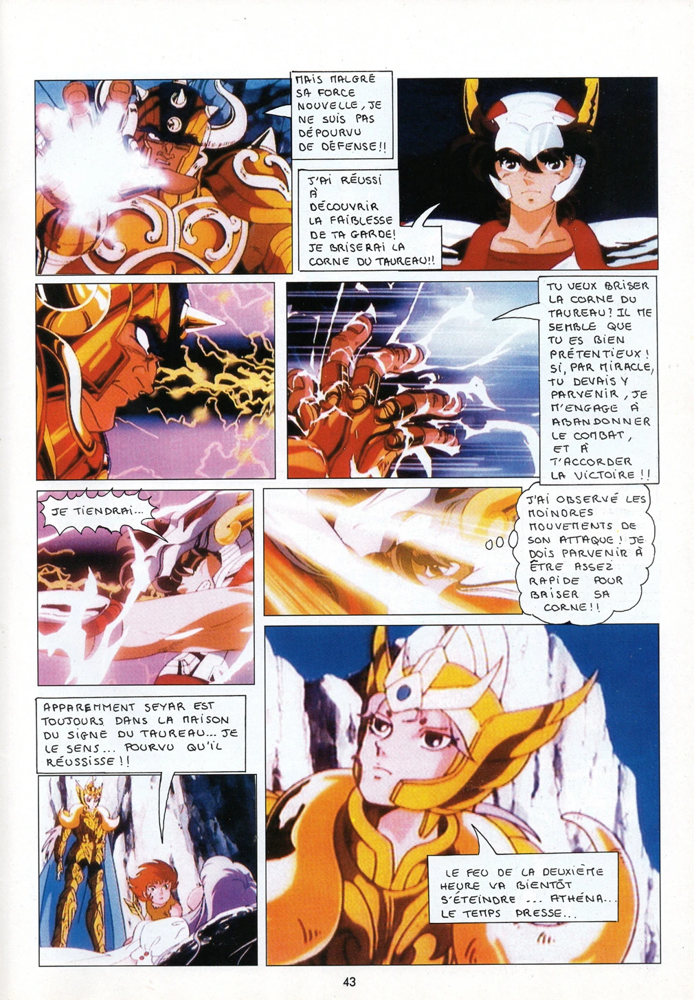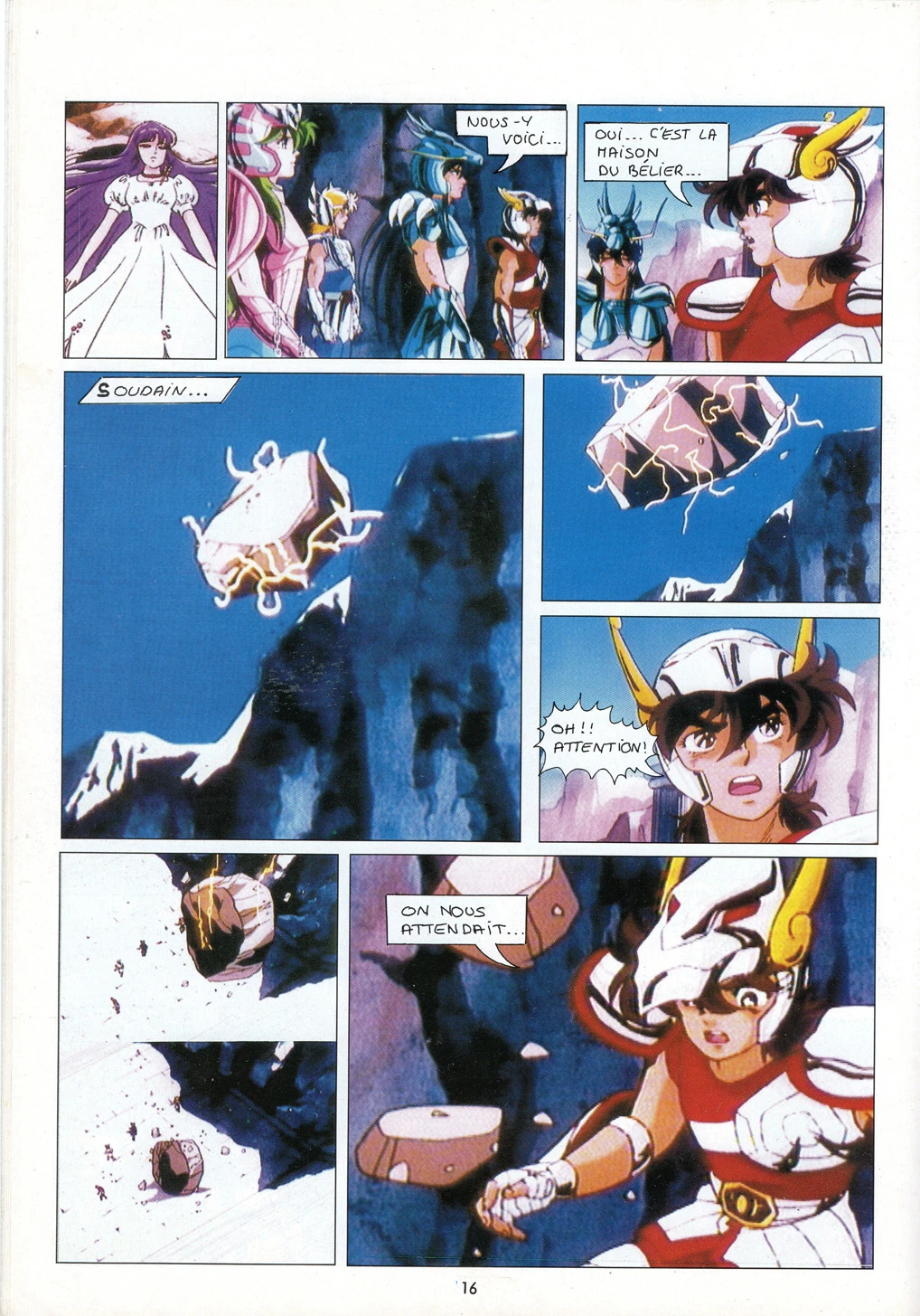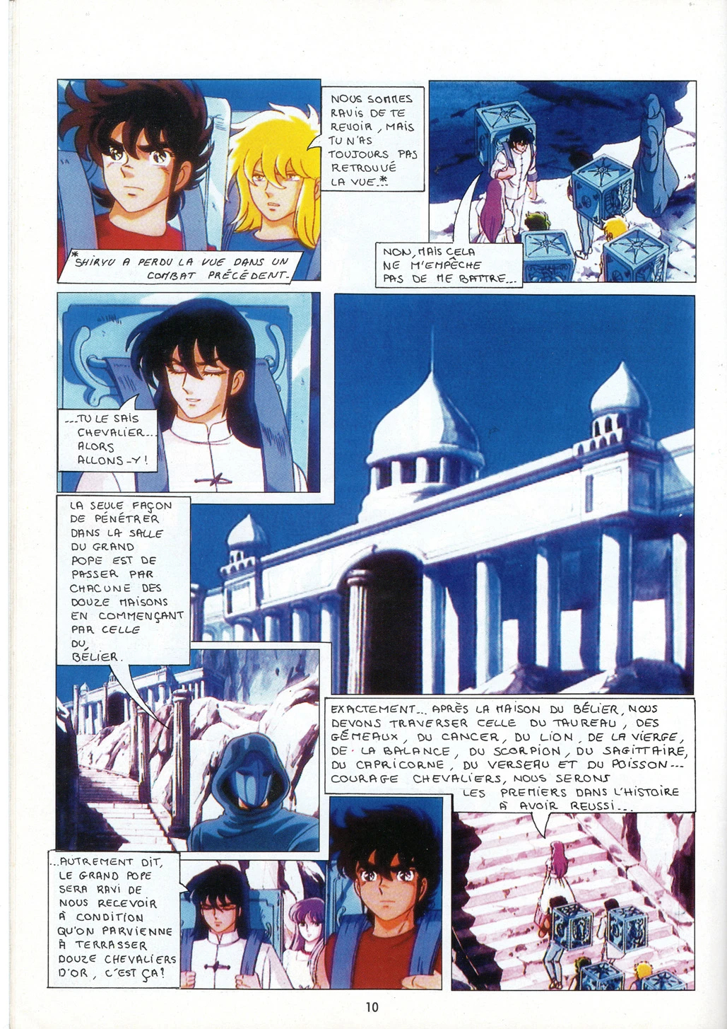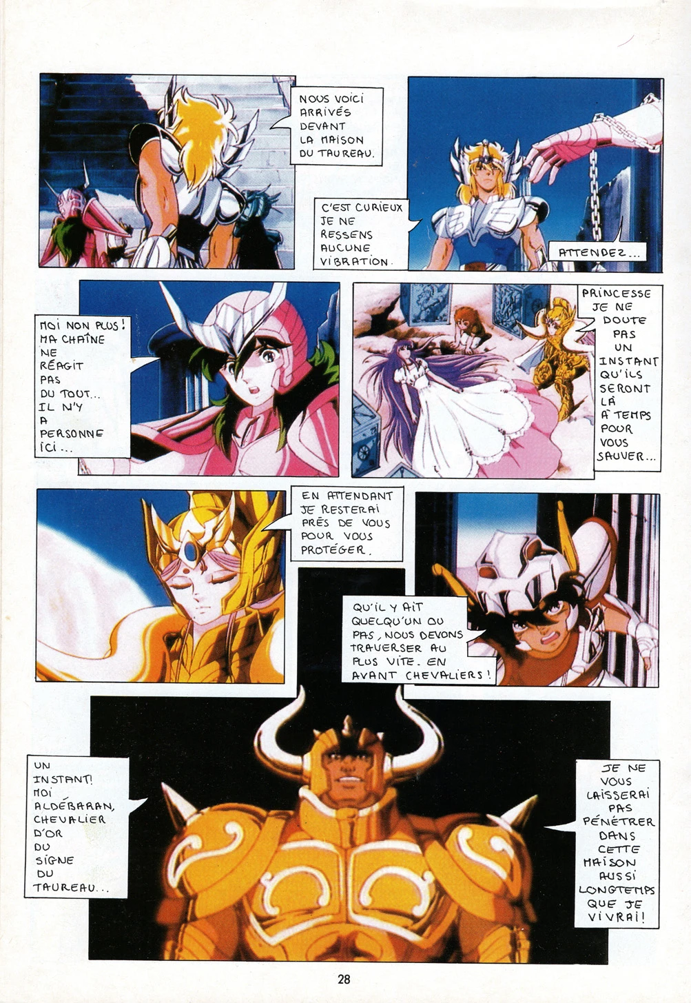 Athéna, accompagnée de nos quatre chevaliers de Bronze, se rend au Sanctuaire où elle est agressée par Trémi, qui lui fiche une flèche d’or dans le coeur. Nos quatre héros ont douze heures pour la sauver. Ils doivent pour cela traverser les douze maisons gardées par les redoutables chevaliers d’Or. Le premier est Mû du Bélier, un ami, qui répare leurs armures et leur prodigue des conseils. Le suivant est Aldébaran du Taureau, un adversaire bien plus coriace…